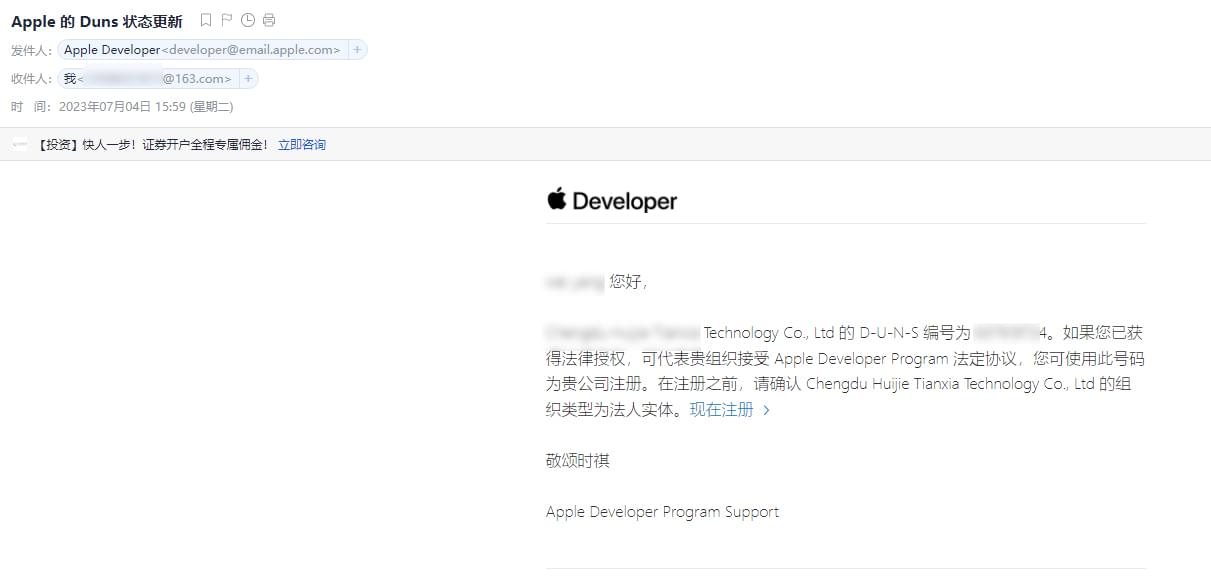 APP有兩種身份的上架模式。一種是個(gè)人身份,另外一種是企業(yè)身份。如果是用企業(yè)身份申請(qǐng)上架,需要申請(qǐng)九位數(shù)的鄧白氏編碼。有時(shí)候蘋(píng)果開(kāi)發(fā)者官網(wǎng)申請(qǐng)鄧白氏編碼的鏈接打不開(kāi),就需要聯(lián)系鄧白氏中國(guó)區(qū)的代理公司,嚴(yán)格按照對(duì)方的郵件要求進(jìn)行申請(qǐng)。下面是小火科技公司給客戶(hù)申請(qǐng)鄧白氏編碼的截圖: