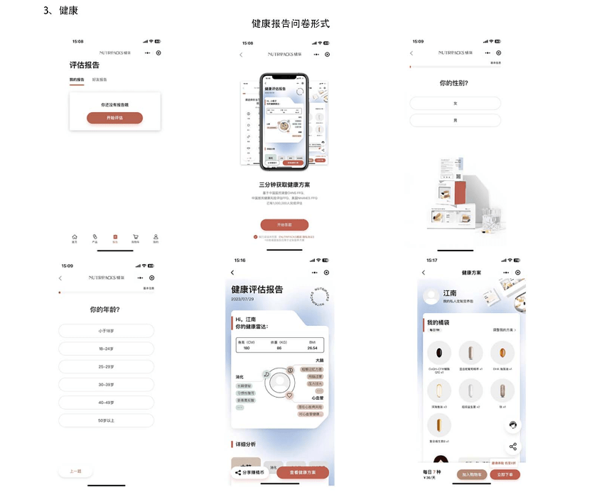健康流程:評(píng)估一問卷答題一健康評(píng)估一健康方案(根據(jù)用戶身體狀況進(jìn)行產(chǎn)品推薦方案)問卷內(nèi)容會(huì)分為: