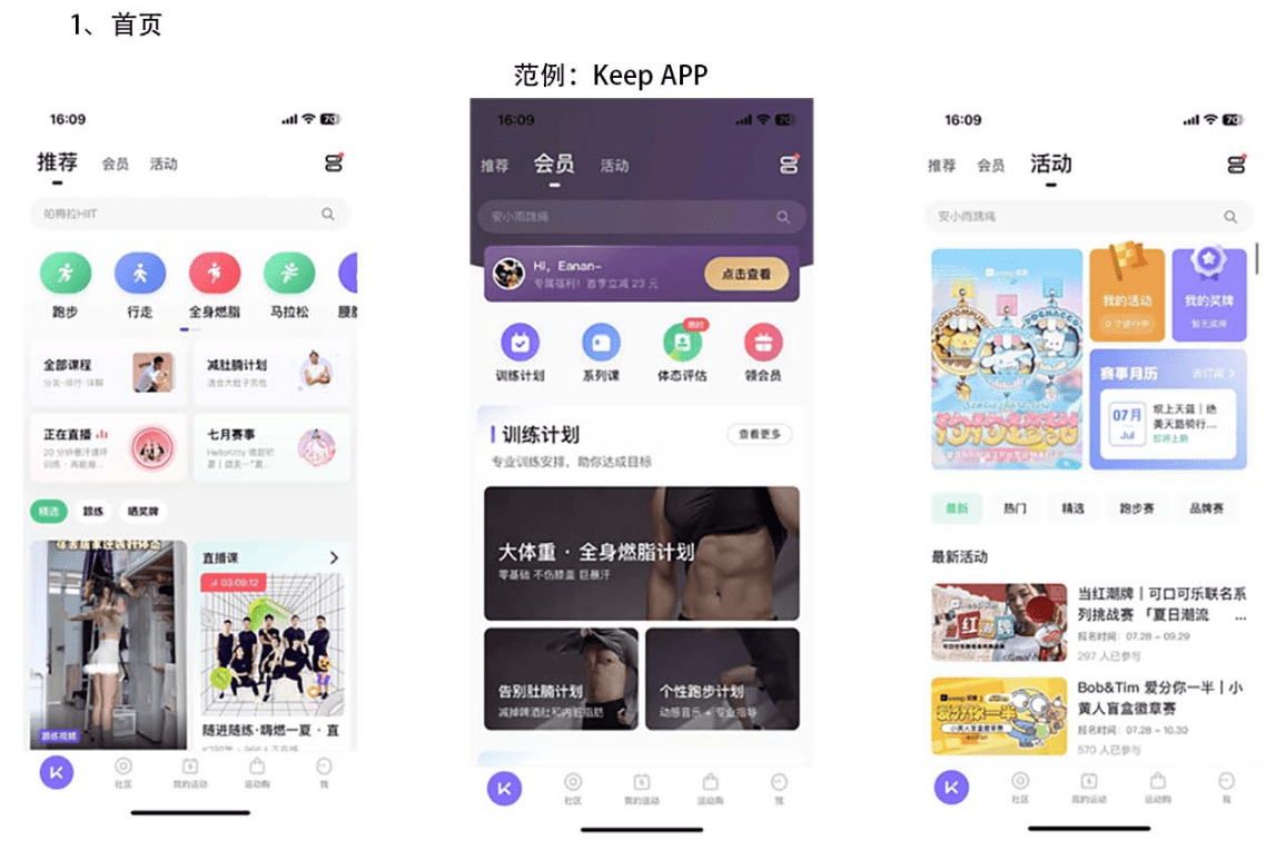 首頁-推薦:推薦頁面加載一些社區(qū)評(píng)論較高內(nèi)容,活動(dòng)頁面報(bào)名內(nèi)容,健康知識(shí)相關(guān)內(nèi)容,全站系統(tǒng)內(nèi)推薦