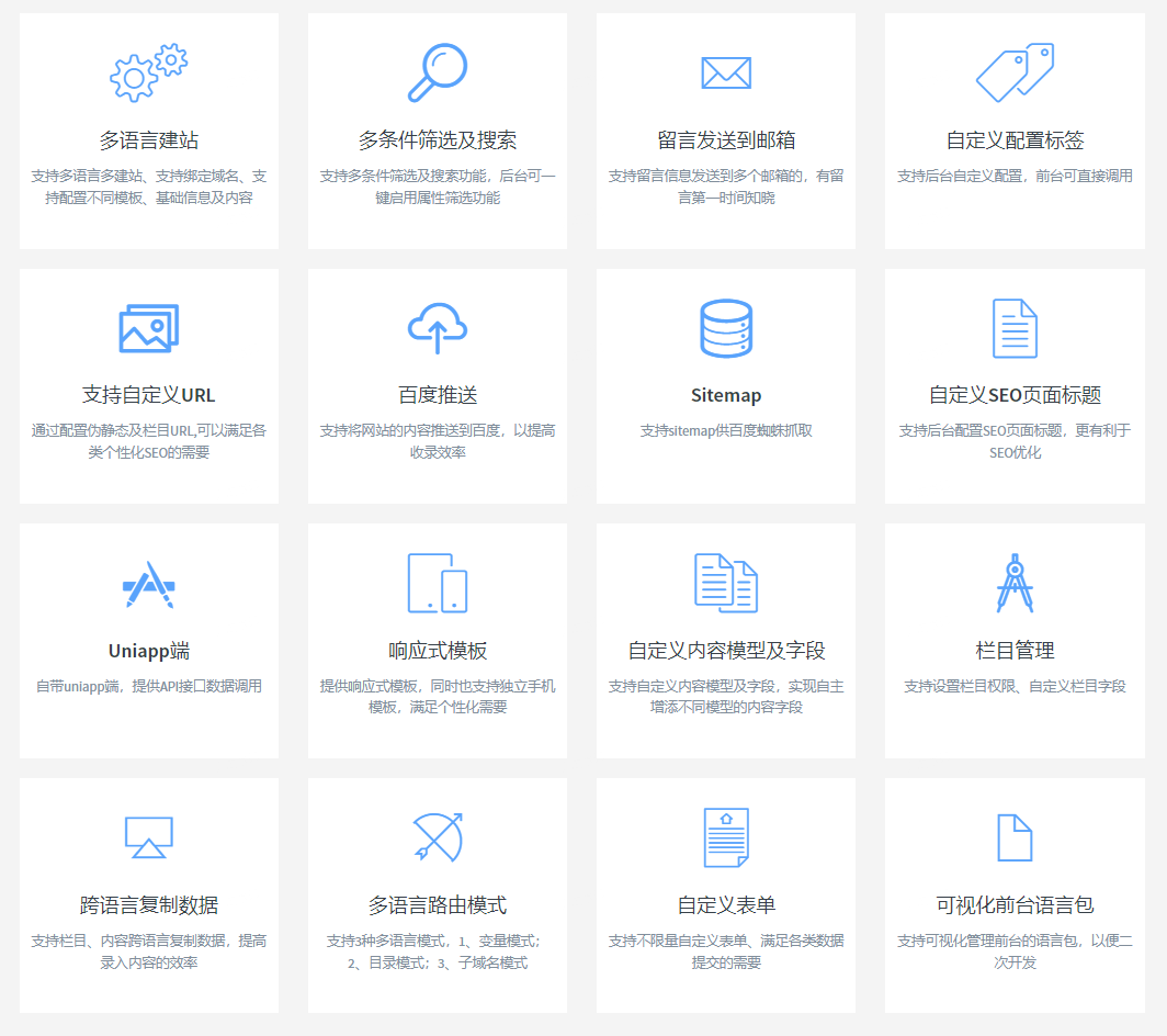 17. 可視化前臺語言包:平臺支持可視化管理前臺的語言包,以便二次開發(fā)。這有助于企業(yè)根據(jù)需求調(diào)整網(wǎng)站內(nèi)容,提升用戶體驗。