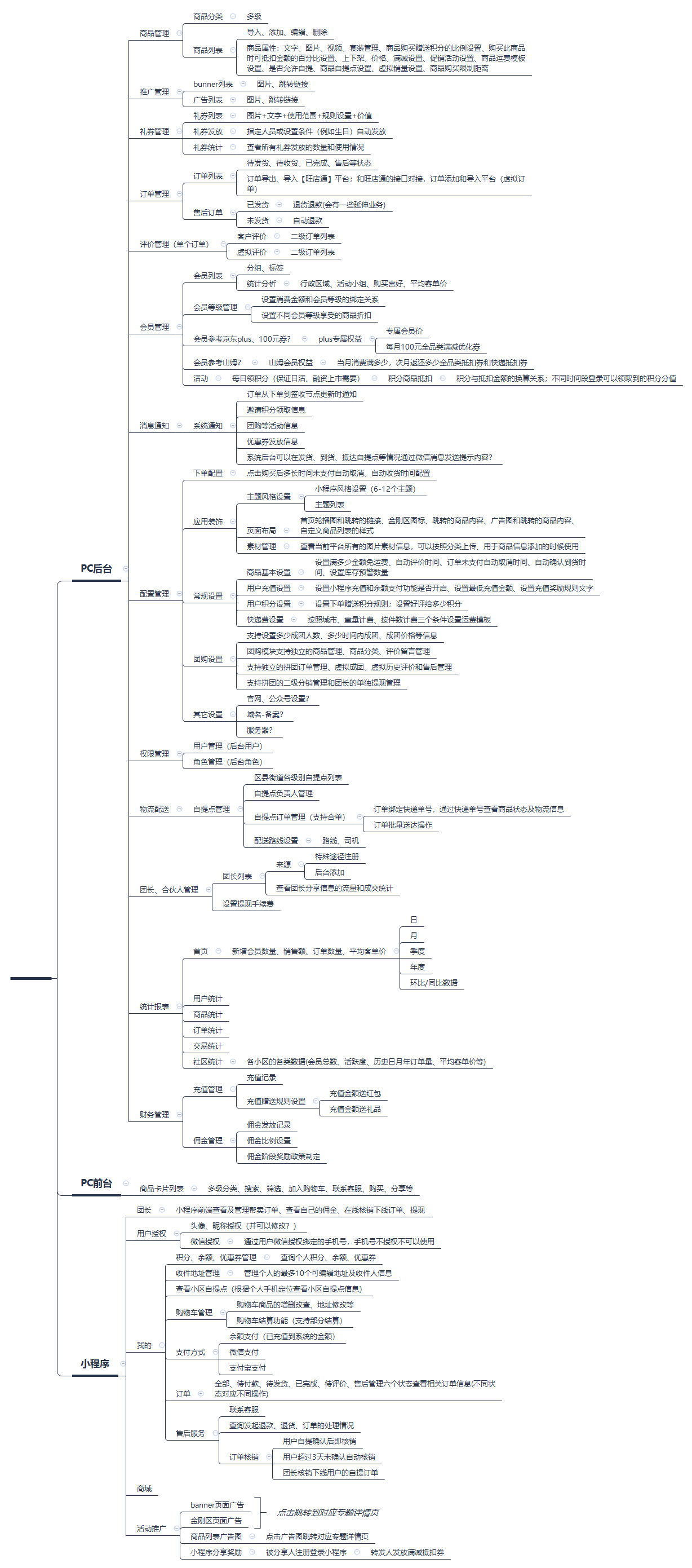 本商城采用PC管理端,管理后臺包括:商品管理、推廣管理、禮券管理、訂單管理、評價管理、會員管理(重點(diǎn))、消息通知、配置管理(重點(diǎn))、權(quán)限管理、物流配送、團(tuán)長、合伙人管理(重點(diǎn))、統(tǒng)計報表、財務(wù)管理。
