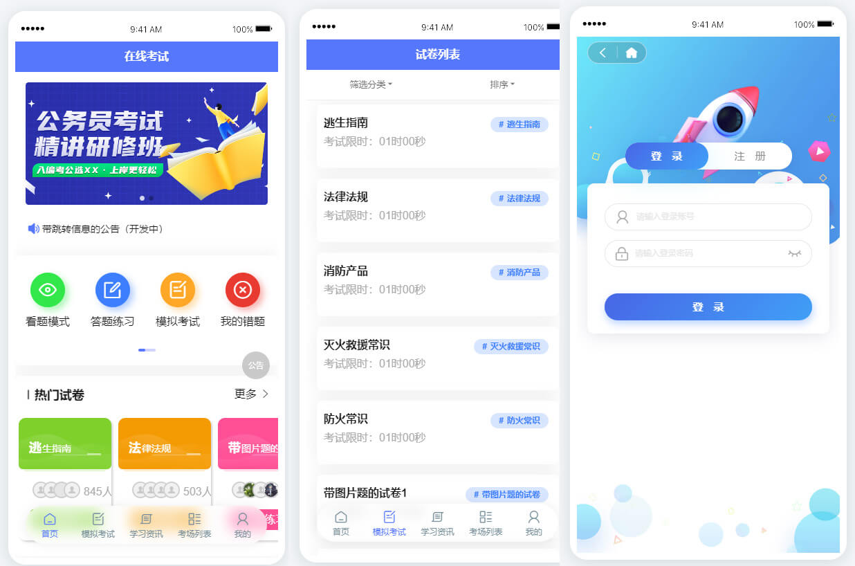 考試系統(tǒng)支持模擬考試,用戶可以在模擬考試中熟悉考試流程和題型。同時(shí),考試系統(tǒng)還支持考卷分類,用戶可以根據(jù)學(xué)科、知識(shí)點(diǎn)等進(jìn)行考卷分類,便于管理和復(fù)習(xí)。