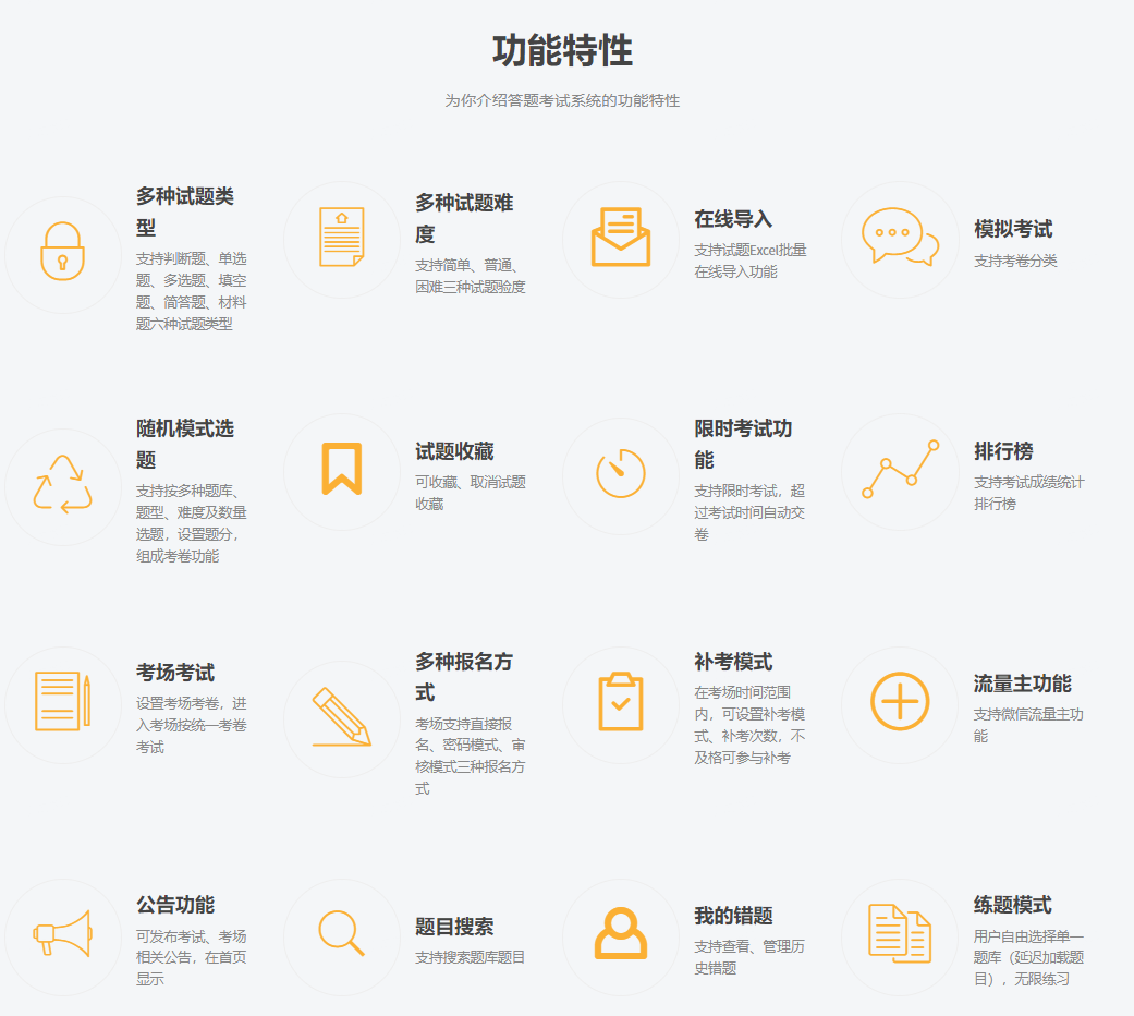 考試系統(tǒng)支持設(shè)置考場(chǎng)考卷,用戶可以進(jìn)入考場(chǎng)按統(tǒng)一考卷進(jìn)行考試。同時(shí),考試系統(tǒng)支持微信流量主功能,可以讓用戶在微信平臺(tái)上進(jìn)行分享和傳播。