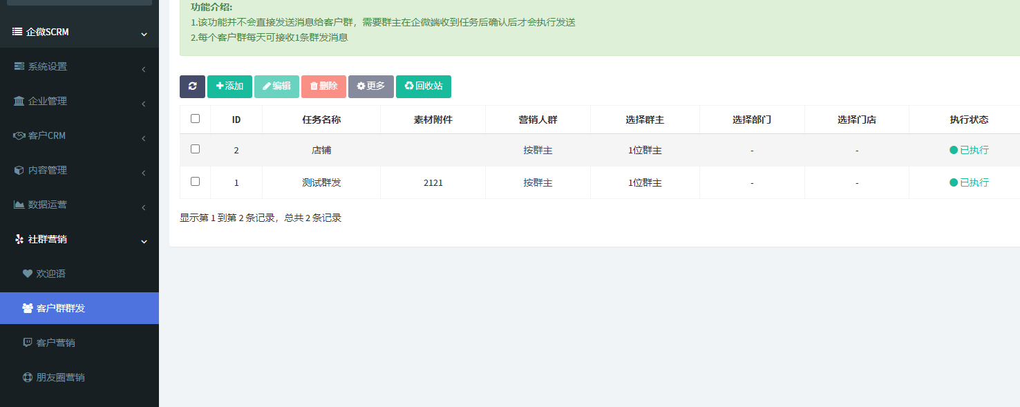 群發(fā)營(yíng)銷功能模塊允許企業(yè)通過(guò)后臺(tái)設(shè)置群發(fā)任務(wù)及執(zhí)行員工,一鍵群發(fā)至客戶個(gè)微和群聊。這樣,企業(yè)可以快速地將營(yíng)銷信息傳達(dá)給客戶,提高信息傳達(dá)效率。
